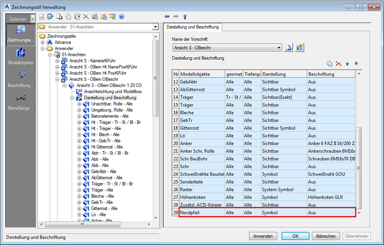 Für GA/Übersichtszeichnungen können Sie die Nordpfeile durch Konfigurieren des Zeichnungsstils aktivieren.