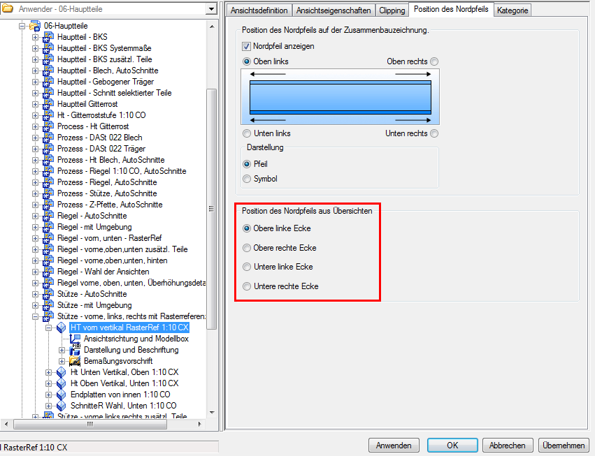 Nordpfeile in Übersichtszeichnungen werden nur für Baugruppen (Hauptteile) erstellt, die bereits mit aktiviertem Nordpfeil detailliert wurden.