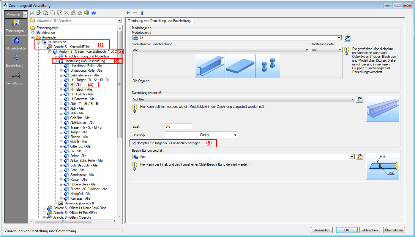 - Aktivieren Sie auf der rechten Seite des Dialogfelds (Registerkarte Objektdarstellung) das Kontrollkästchen Nordpfeil anzeigen. für Träger in 3D-Ansichten (5)