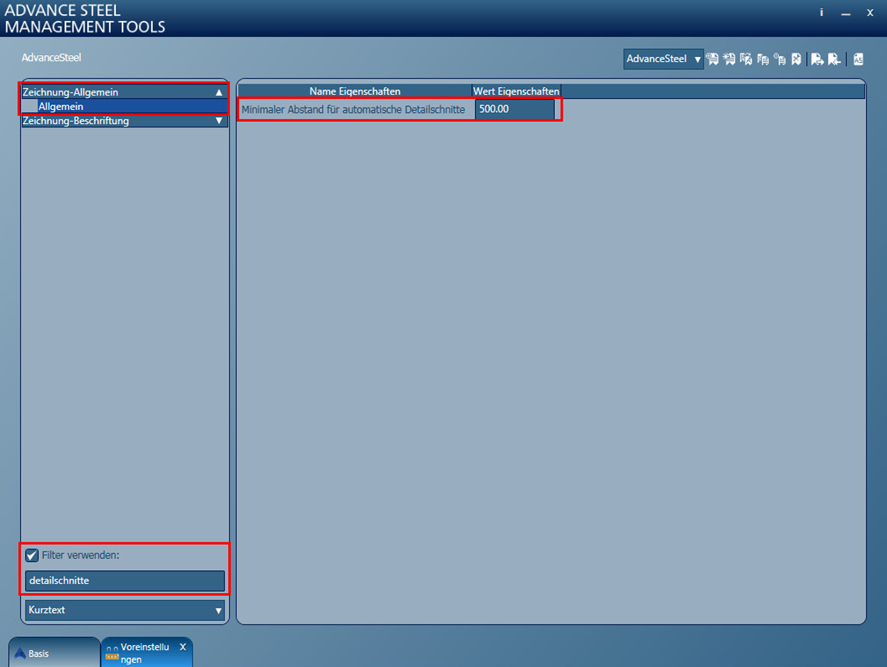 Für Schnittansichten hängt die Anzahl der im Modell angezeigten interaktiven Auswahlmöglichkeiten außerdem vom Wert der Vorgabe Minimaler Abstand für automatische Detailschnitte ab. Dieser Parameter befindet sich in der Kategorie Einstellungen\Vorgaben\Zeichnung-Allgemein aus den Management Tools.