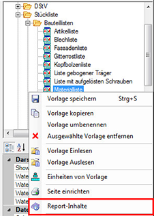 - Beispiel: Klicken Sie mit der rechten Maustaste auf Material und wählen Sie Report-Inhalte aus dem Kontextmenü.