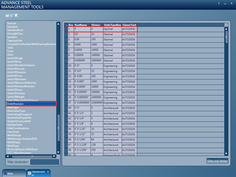 Die erste Zahl ist der Einheitenschlüssel aus den Tabellen in der Datenbank AstorBase, beginnend mit UnitsOf... (z. B. für eine Entfernung wäre es von UnitsOfDistance). Die zweite Zahl ist der Einheitentyp aus der Tabelle UnitsType in der Datenbank AstorBase. Die dritte Zahl ist die Einheitengenauigkeit aus der Tabelle UnitsPrecision in der Datenbank AstorBase. Im obigen Beispiel haben wir [3,3,1] verwendet, das heißt: Schlüssel 3 aus der Datenbank AstorBase, Tabelle UnitsOfDistance: Millimeter.