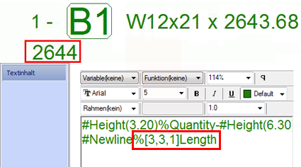 In Advance Steel werden die Einheiten für jedes Modell, jede Zeichnung und jede Liste definiert. Dies bedeutet, dass eine Zeichnung eine bestimmte Einstellung für die Einheiten und für die Genauigkeit enthält. In bestimmten Fällen ist es erforderlich, eine andere Genauigkeit oder Einheit für ein einzelnes Element einzustellen. Dies ist in Advance Steel möglich, indem Sie nur für eine Beschriftung eine andere Einheit und Genauigkeit definieren. Um dies zu erreichen, müssen Sie zum Token die Ergänzung [1,2,3] hinzufügen, z. B. für das Token %Länge wäre dies %[1,2,3]Länge, wobei die 1, 2, 3 durch die erforderlichen Schlüssel aus den Einheitentabellen in AstorBase ersetzt werden.