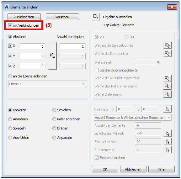 Diese Funktion kann verwendet werden, um das Schweißnahtobjekt zu kopieren. In diesem Fall ist es nicht erforderlich, die Option mit Verbindung auszuwählen. Die beiden Optionen in dieser Kopierfunktion sind: