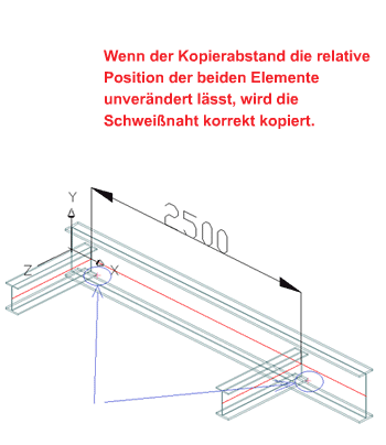 Element kopieren unter Verwendung der Option mit Verbindungen. Dadurch werden die Elemente kopiert und eine entsprechende Schweißnaht erstellt.