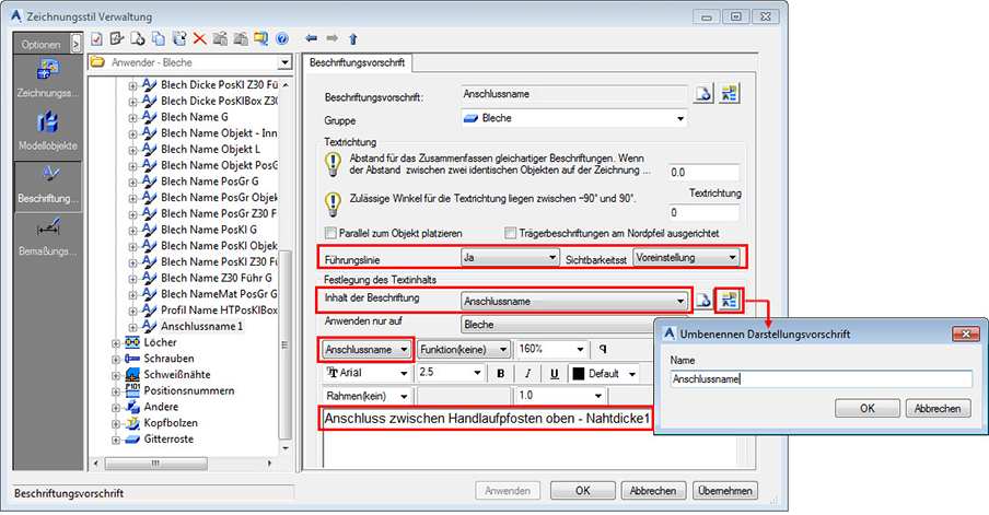 Nachdem Sie die Vorschrift festgelegt haben, ändern Sie den Zeichnungsstil, damit Sie die Ansicht erstellen können. Ändern Sie unter Darstellung und Beschriftung den Beschriftungstyp der Bleche und wählen Sie aus der Kategorie Bleche die Vorschrift Anschlussname.