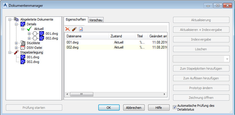 Die ausgewählten Detailzeichnungen werden in einer neuen Verzweigung mit der Bezeichnung Stapelzerlegung gezeigt.