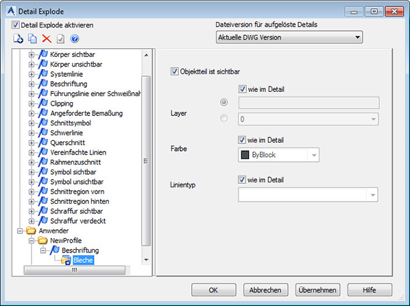 Definieren Sie auf der rechten Seite des Fensters die Auflösungseinstellungen. Ein Objekt bzw. Unterobjekt kann aktiviert oder deaktiviert, auf einer anderen Ebene platziert und mit einer anderen Farbe oder mit einem anderen Linientyp dargestellt werden.
