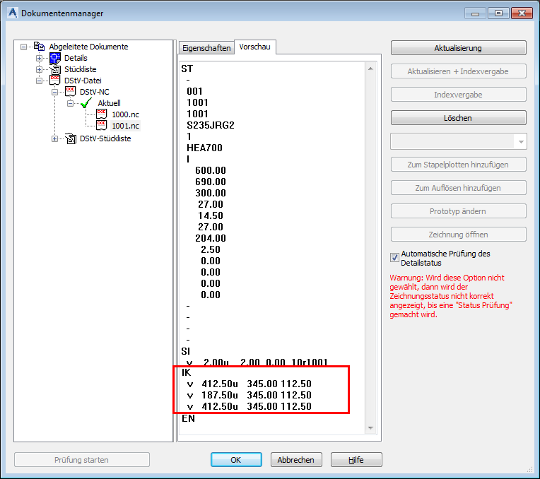 Wenn der Träger beispielsweise einen Lochdurchmesser von 225 auf seinem Steg aufweist, erhalten Sie den folgenden NC-DStV-Dateiinhalt: