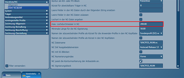 Um dies zu bestimmen, verwenden Sie die Vorgabe Max. Lochdurchmesser in NC‟ aus den Management Tools.
