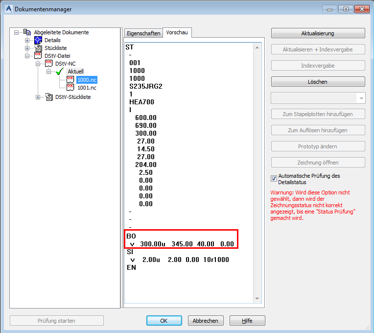 In unserem Beispiel wird diese Vorgabe auf 200 eingestellt. Wenn der Lochdurchmesser kleiner als 200 ist, wird das Loch in einem BO-Block (für Löcher) beschrieben, ist der Lochdurchmesser dagegen größer als 200, wird das Loch in einem IK-Block (für kreisförmige Schnitte) beschrieben. Wenn also der Träger auf seinem Steg beispielsweise einen Lochdurchmesser von 40 aufweist, erhalten Sie den folgenden NC-DStV-Dateiinhalt: