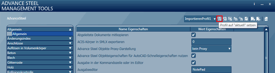 Das neu importierte Profil kann als aktuell festgelegt werden, indem Sie den Befehl Profil auf "aktuell" setzen verwenden. Nach dem Öffnen von Advance Steel sind alle Vorgabeeinstellungen verfügbar.