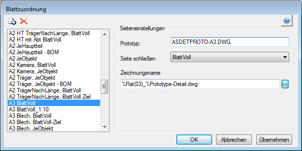 - Im Dialogfeld Blattzuordnung können Sie den verwendeten Prototyp und den Namen der Zeichnung sehen.