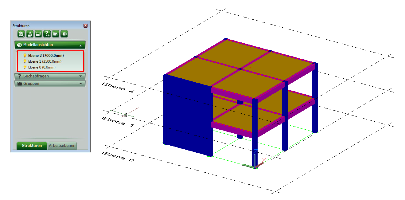 Wenn eine Ebene aktiviert ist, werden die neuen Modellelemente auf den Arbeitsebenen der aktivierten Ebene erstellt.