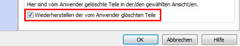 Um die gelöschten Elemente wiederherzustellen, wählen Sie Wiederherstellen der vom Anwender gelöschten Teile im Dialogfeld Eigenschaften der Zeichnung.