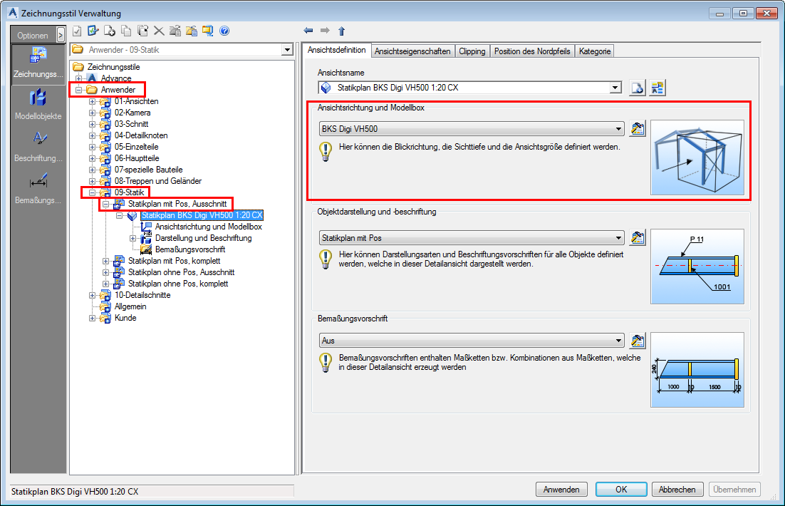 - Die Registerkarte Ansichtsrichtung und Modellbox wird geöffnet. Hier werden die Parameter des Z-Ansichtsfensters angezeigt.