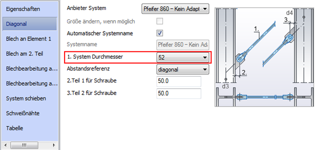 Wenn der Benutzer den Anschluss an Trägern erstellt, kann der Systemdurchmesser in den Optionen für den Anschluss gewählt werden.