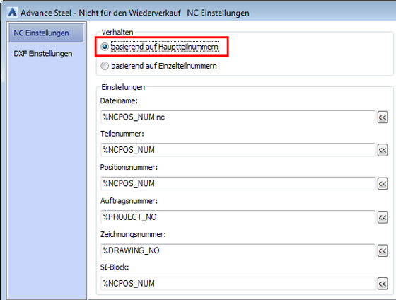 - Scribing wird nur für Hauptteile verwendet. Im Dialogfeld NC Einstellungen muss als Verhalten Basierend auf Hauptteilnummern definiert sein.