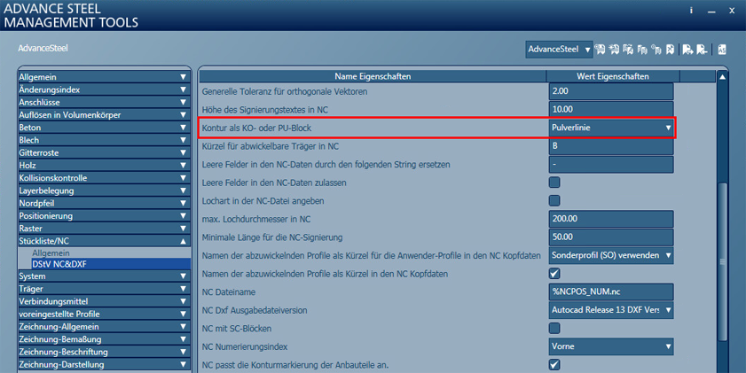 In der NC-Datei werden Scribing-Informationen entweder im PU-Block (Pulver) oder im KO-Block (Körner) angezeigt, je nachdem, welcher dieser Blöcke in der Vorgabe Kontur als KO- oder PU-Block festgelegt wurde. Der Unterschied zwischen den Blocknamen wird von der NC-Maschine erkannt, da die Informationen innerhalb des Blocks in beiden Fällen identisch sind.
