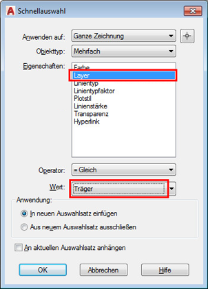 - Legen Sie im Dialogfeld Schnellauswahl die folgenden Einstellungen für den Layernamen fest: