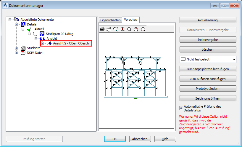 - Öffnen Sie über das Fenster Dokumentenmanager die erstellte Detailzeichnung.