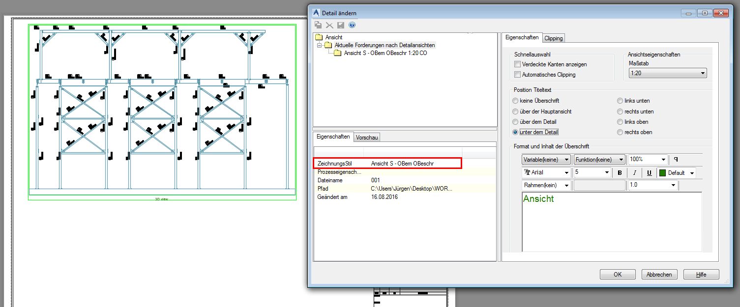 Ihre Detailzeichnung wird unter Verwendung des im Dialogfeld Kamera festgelegten Zeichnungsstils (3D View - Model - Labels) erstellt, nicht mit dem Stil in der Prozessdetail-Zuordnung (Elevation View - Line).