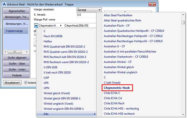 Anwenderprofile können Strukturelementen von Treppen zugewiesen werden, z. B. der Wange. Auf diese Weise können Sie für das Element jede Profilform verwenden und die aktuelle Profilbibliothek ausfüllen.