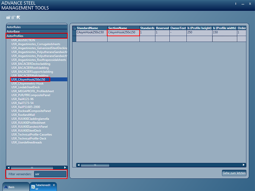 - Suchen Sie in der Datenbank AstorRules mithilfe des Filters nach der Tabelle RULE_StairStringerUserSections.