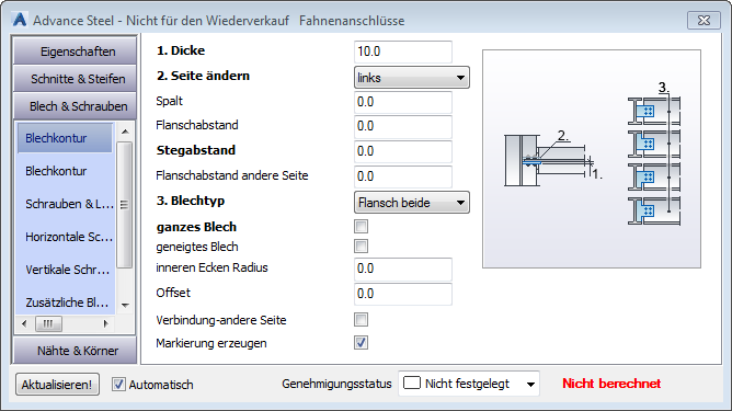 Das Fahnenblech wird erstellt und das Dialogfeld Eigenschaften wird angezeigt. Ändern Sie die Eigenschaften des Fahnenblechs, um die spezifischen Anforderungen zu erfüllen.