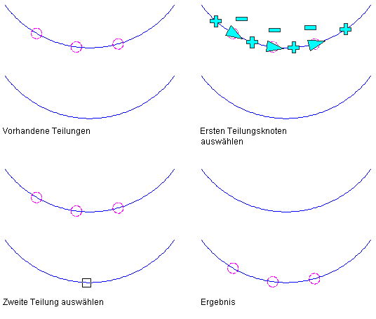 Gehen Sie wie folgt vor, um eine Teilung eines Objekts zu einem anderen Objekt zu verschieben. Der Layoutmodus bleibt bei dieser Aktion erhalten. Wurde die Teilung ursprünglich mit gleichmäßig verteilten Knoten eingefügt, bleiben die Knoten auch auf dem neuen Objekt gleichmäßig verteilt.