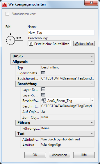 Gehen Sie folgendermaßen vor, um ein Bauteilstempelwerkzeug zu erstellen und es in eine Werkzeugpalette einzufügen. Sie sollten Werkzeuge erstellen, die verschiedene Informationen als Attribute für verschiedene Objekttypen anzeigen.