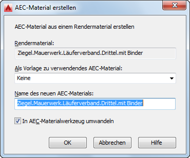 - Wenn Sie das Rendermaterial direkt in eine Zeichnung gezogen haben, wird das Arbeitsblatt AEC-Material erstellen angezeigt.