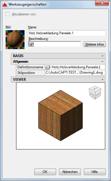 Das Materialwerkzeug wird jetzt in der Palette durch das Würfelsymbol von AutoCAD Architecture toolset mit der gewünschten Materialdarstellung angezeigt.