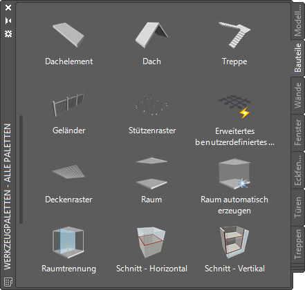 Vom CAD-Manager oder anderen Benutzern erstellte Werkzeugpaletten können ebenfalls Geländerwerkzeuge mit Geländerstilen und -eigenschaften enthalten, die für Ihre Projekte oder Anforderungen angepasst sind.