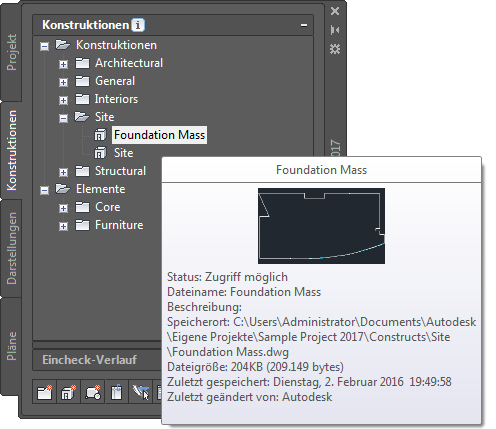 Im Projekt-Navigator können Sie Miniaturansichten von Projektzeichnungen anzeigen. Es kann eine Vorschaugrafik, eine Detailvorschau und einer Kombination aus beidem eingeblendet werden. Miniaturansichten können beim Navigieren in großen Projekten mit vielen Zeichnungen hilfreich sein.