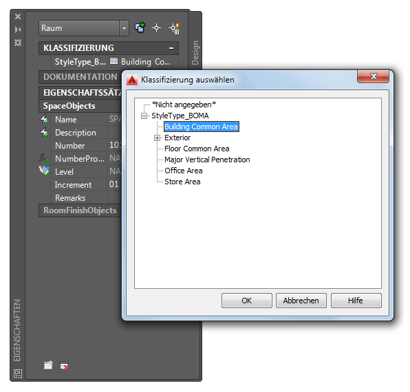 Wenn Sie beispielsweise den BOMA-Flächenberechnungsstandard für Ihre Zeichnung ausgewählt haben, wird die BOMA-Klassifizierungsdefinition angezeigt.