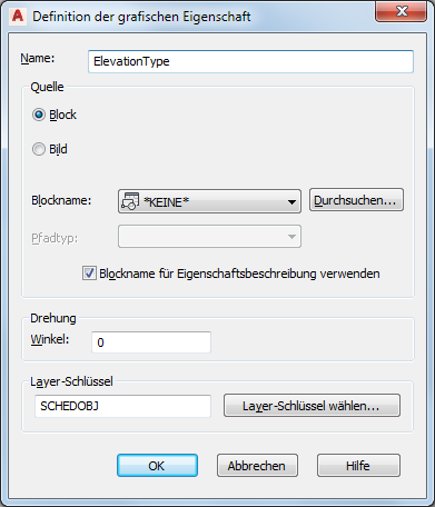 Gehen Sie wie folgt vor, um eine Definition der grafischen Eigenschaft zu einer Eigenschaftssatz-Definition hinzuzufügen. Werte für grafische Eigenschaften können Blöcke in der aktuellen Zeichnung oder Bilddateien (BMP, GIF, JPG, PNG oder TIF) sein. Die angezeigten Bilder können nicht direkt bearbeitet werden.