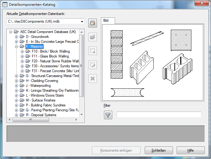 Im Dialogfeld Detailkomponenten-Katalog können Sie in verschiedenen Detailkomponenten-Datenbanken nach Komponenten suchen. Eine hierarchische Baumstruktur und eine Filterfunktion erleichtern die Suche nach einzelnen Komponenten in der Datenbank. Nachdem Sie eine entsprechende Komponente gefunden haben, können Sie sie in die Zeichnung einfügen oder durch Ziehen und Ablegen in eine Werkzeugpalette kopieren, wenn Sie sie häufig verwenden möchten. Beachten Sie, dass die fünf vertikal in der Mitte des Dialogfelds angeordneten Schaltflächen nur zur Verfügung stehen, wenn Sie Bearbeitungsrechte für die ausgewählte Datenbank haben.