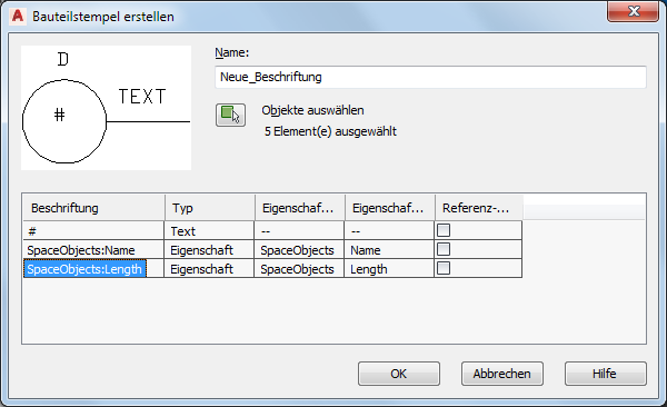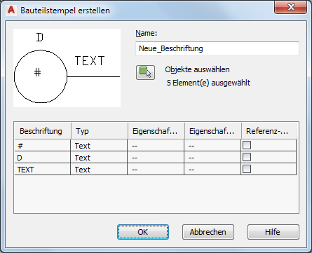 | Erstellen eines Bauteilstempels aus einer vorhandenen Beschriftung | Klicken Sie auf ![]() . ![]() ![]() . |
