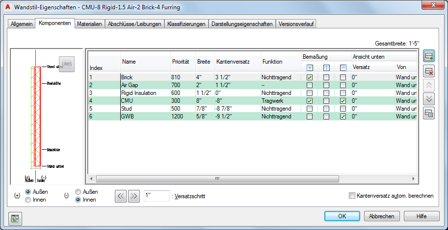 Über die Registerkarte Komponenten im Dialogfeld Wandstile können Sie Wandkomponenten wie von Ihnen festgelegt anzeigen lassen.