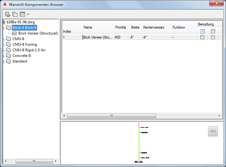 Wandkomponenten eines Wandstils können nicht nur durch Festlegen ihrer individuellen Eigenschaften, sondern auch durch Kopieren bestehender Komponenten aus anderen Wandstilen erstellt werden. Der Wandstil-Browser ist ein Dienstprogramm, mit dem Sie die Komponenten anderer Wandstile anzeigen und in den Wandstil kopieren können, den Sie gerade bearbeiten.