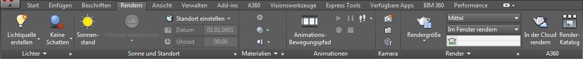 Diese Registerkarte enthält alle Befehle zum Rendern sowie für Materialien, Beleuchtung, Kameras und Animationen.