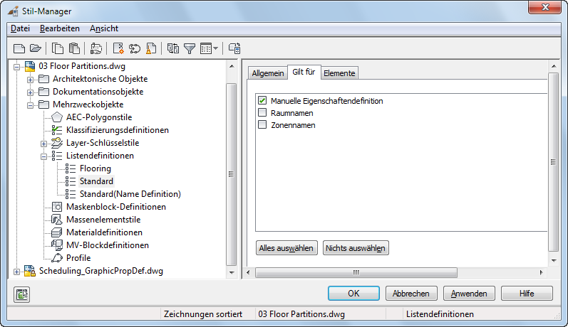 Anmerkung: Listendefinitionen können auch für Raum- und Zonennamen erstellt werden.