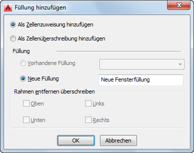 Als Zellenüberschreibung hinzufügen, wobei Sie eine Tür oder ein Fenster mit einem anderen als dem in der Zeichnung vorhandenen Stil einfügen und eine Kante des Rahmens entfernen möchten, der das Objekt umgibt. Wählen Sie Neue Füllung, und geben Sie einen Objektnamen ein. Wählen Sie für Rahmen entfernen überschreiben eine der Optionen Oben, Unten, Links oder Rechts, und klicken Sie auf OK.