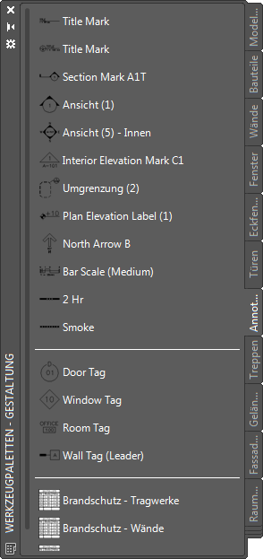 Die vorgegebenen Werkzeugpaletten im Arbeitsbereich enthalten Beispielwerkzeuge für Höhenkoten, die nach Bedarf verwendet und angepasst werden können. Darüber hinaus bieten die folgenden im Lieferumfang der Software enthaltenen Kataloge Höhenkotenwerkzeuge, die den Werkzeugpaletten hinzugefügt werden können: