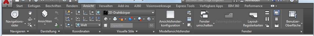 - Darstellung: Hier können Sie die vordefinierten Ansichten auswählen, neue Ansichten erstellen, den Ansichts-Manager öffnen, einen visuellen Stil auswählen und 2D- und 3D-Navigationseinstellungen festlegen. Sie haben Zugriff auf vordefinierte Anzeigethemen. Außerdem können Sie Zuschneideebenen anpassen und die Befehle zum Neugenerieren aufrufen.