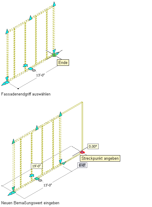 Insgesamt werden drei dynamische Bemaßungstypen mit Griffen dargestellt: