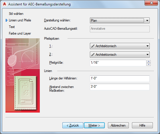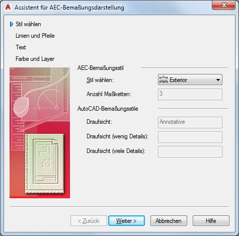 Wählen Sie den zu bearbeitenden AEC-Bemaßungsstil, und klicken Sie auf Weiter.