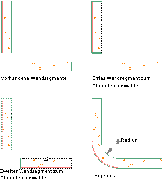 In der folgenden Abbildung wird gezeigt, wie zwei Wandsegmente mit einem angegebenen Radius abgerundet werden.