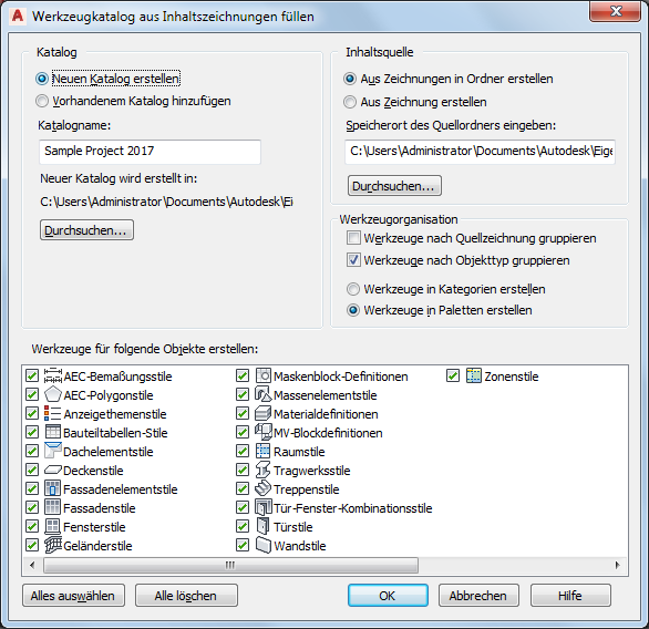 Anmerkung: Wenn beide Optionen aktiviert wurden, wird die Zeichnung zunächst nach den Zeichnungen und anschließend nach dem Objekttyp gruppiert, sodass Kategorien aus den Zeichnungen und Paletten aus den Objekttypen erstellt werden. Dies ist fest vorgegeben, da Paletten nicht verschachtelt werden können. Die Optionsfelder für Kategorien und Paletten stehen dann nicht zur Verfügung, und die Option Werkzeuge in Paletten erstellen ist automatisch ausgewählt.